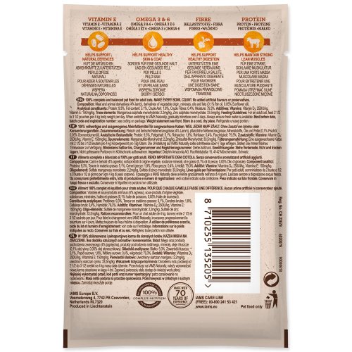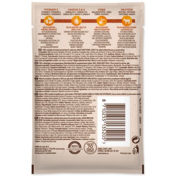 Kompletní vlhké krmivo s jehněčím masem pro dospělé kočky od 1 roku.vysoce stravitelnébez sóji, pšenice, umělých barviv, dochucovadel a koncentrovaných bílkovin na rostlinné bázikvalitní bílkoviny - správné osvalenířepné řízky a jablečné výlisky - obsah vlákniny pro správné tráveníomega 3 a 6 mastné kyseliny - zdravá a lesklá srst a kůževitamín E - podpora imunity Složení:Maso a živočišné deriváty, ryby a rybí deriváty (4% losos), deriváty zeleninového původu (0,5% řepná vláknina), minerály, oleje a tuky (0,1% rybí olej, 0,05% slunečnicový olej.Doplňkové látky:Vitamín D3: 250IU, vitamín E: 150 mg / kg.Stopové prvky: síran manganatý monohydrát (E5 - Mn): 2,2 mg / kg, síran zinečnatý monohydrát (E6 - Zn) 33,5 mg / kg.Analytické složky:Hrubé proteiny: 9,3%, hrubé oleje a tuky: 5,1%, hrubé popeloviny: 1,8%, hrubá vláknina: 0,4%, vlhkost: 79,3%. Denní dávkování:Dospělou kočku s hmotností 4 kg krmte denně 2,25 až 3,5 kapsičkami.