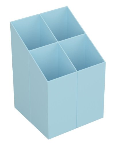 Stojánek na psací potřeby z pevného plastu. 4 stejně velké přihrádky. Rozměry: 7,5 x 11 x 7,5 cm