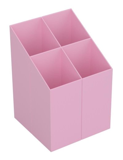 Stojánek na psací potřeby z pevného plastu. 4 stejně velké přihrádky. Rozměry: 7,5 x 11 x 7,5 cm
