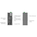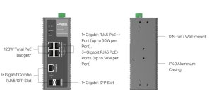 Hardwarové parametry: *Rozhraní: 1× 10/100/1000 Mbps PoE++ RJ45 Ports 3× 10/100/1000 Mbps PoE+ RJ45 Ports 1× Gigabit SFP/RJ45 Combo Slot 1× Gigabit SFP Slot Auto-Negotiation/Auto MDI/MDIX *Počet ventilátorů: Bez ventilátorů *Instalace: montáž na DIN lištu, na stěnu *Fyzický bezpečnostní zámek: Ano *Napájení: 12–57 V 1+1 redundantní stejnosměrný napájecí vstup *Rozměry (Š × H × V): 6,1 × 4,7 × 2,4 in (155 × 120 × 60 mm) *Ochrana proti přepětí: ±6 kV v běžném režimu pro ethernetové porty ±4 kV v běžném režimu pro vstupní porty stejnosměrného napájení