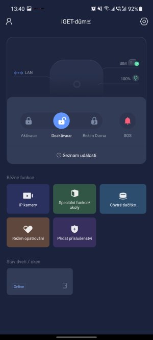 - Režim "Opatrování" - speciální funkce pro opatrování např. starších rodičů, uživatel zvolí, které senzory a v jaké časové době mají hlídat aktivitu lidí v daném objektu, pokud se ve zvolenou dobu neprojevuje aktivita, alarm upozorní pomocí notifikace, spíná se při režimu Doma a Deaktivováno.