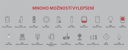 - Mnoho možností nastavení poplachových zón, každý senzor lze pojmenovat vlastním názvem.
