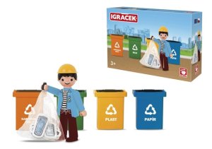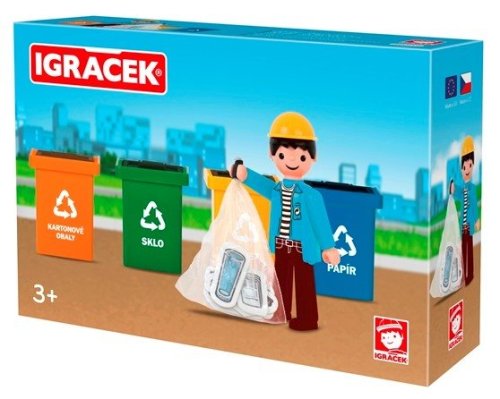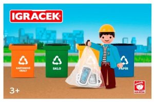 Jak správně třídit odpad? I to vás naučí Igráček. Balení obsahuje igráčka, 4 popelnice na tříděný odpad a odpadky.