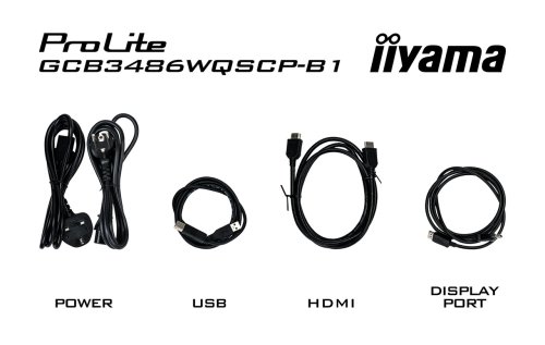Obsah balení: napájecí kabel (1.85m), USB kabel (1.5m), HDMI kabel (1.85m), DisplayPort kabel (1.85m), manuál, bezpečnostní instrukce