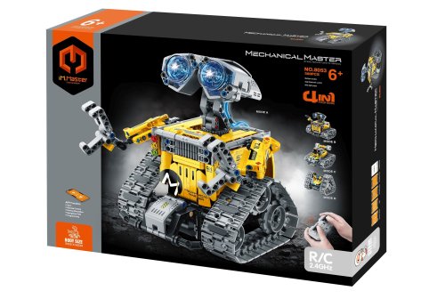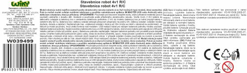 iM.Master Stavebnice robot 4v1 RC ovladač/aplikace. Rozměry 15,5x21x19,5 cm. 560 dílků. 4v1 (2 roboti, 2 vozidla). Možnost ovládat ovladačem nebo aplikací v mobilu pomocí bluetooth. Aplikace - standardní ovládání, polohovací ovládání, simulace volantu, navigování, programování. Frekvence 2.4GHz. Světelné efekty modré hadičky. Dosah 20 m, výdrž až 25 min, nabíjení 2 h. 7.4V 300mAh bateriový pack vestavěný, 2xAA baterie do ovladače nejsou součástí. USB kabel součástí. Přepínač ON/OFF na bateriovém boxu a na ovladači.