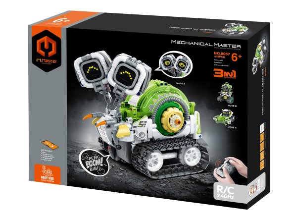 iM.Master Stavebnice robot hlemýžď 3v1 RC na dálkové ovládání. Rozměry 13,5x21,2x18 cm. 478 dílků. Ovládání ovladačem nebo smartphonem. Frekvence 2.4GHz. Bluetooth propojení s mobilem. Aplikace pro iOS a Android. Světelné a zvukové efekty. Bateriový pack 300mah 7.4V lithium do robota součástí, 2xAA do ovladače nejsou součástí. USB kabel součástí. Přepínač ON/OFF na ovladači a bateriovém boxu robota.