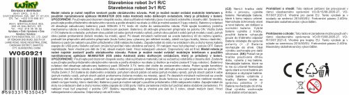 iM.Master Stavebnice robot krokodýl 3v1 RC na dálkové ovládání. Rozměry 34,3x14,5x8 cm. 513 dílků. Ovládání ovladačem nebo smartphonem. Frekvence 2.4GHz. Bluetooth propojení s mobilem. Aplikace pro iOS a Android. Světelné a zvukové efekty. Bateriový pack 300mah 7.4V lithium do robota součástí, 2xAA do ovladače nejsou součástí. USB nabíjecí kabel součástí. Přepínač ON/OFF na ovladači a bateriovém boxu robota.