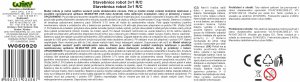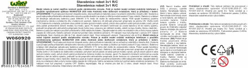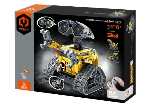 iM.Master Stavebnice robot M 3v1 RC na dálkové ovládání. Rozměry 17,2x15x20,7 cm. 435 dílků. Ovládání ovladačem nebo smartphonem. Frekvence 2.4GHz. Bluetooth propojení s mobilem. Aplikace pro iOS a Android. Světelné a zvukové efekty. Bateriový pack 300mah 7.4V lithium do robota součástí, 2xAA do ovladače nejsou součástí. USB kabel součástí. Přepínač ON/OFF na ovladači a bateriovém boxu robota.