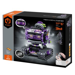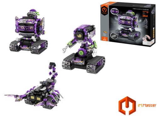 iM.Master Stavebnice robot s čepicí 3v1 RC na dálkové ovládání. Rozměry 17x16,6x20,6 cm. 458 dílků. Ovládání ovladačem nebo smartphonem. Frekvence 2.4GHz. Bluetooth propojení s mobilem. Aplikace pro iOS a Android. Světelné a zvukové efekty. Bateriový pack 300mah 7.4V lithium do robota součástí, 2xAA do ovladače nejsou součástí. Nabíjecí USB kabel součástí. Přepínač ON/OFF na ovladači a bateriovém boxu robota.