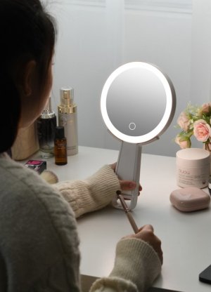 Zrcátko lze snadno zavěsit, pohodlně držet v ruce nebo používat i jako stolní zrcadlo. Stojánek je otočný a pevně drží v jakémkoli úhlu na obou stranách, což zajišťuje maximální flexibilitu při líčení i detailní péči o pleť. Je lehké, skladné a snadno přenosné – ideální společník pro domácí použití i na cesty. Díky vysokému indexu podání barev (CRI > 90 Ra) poskytuje přirozené, jasné a rovnoměrné osvětlení, takže vždy uvidíte skutečné odstíny pleti i make-upu bez zkreslení. Nabíjení probíhá skrze USB-C port.