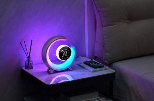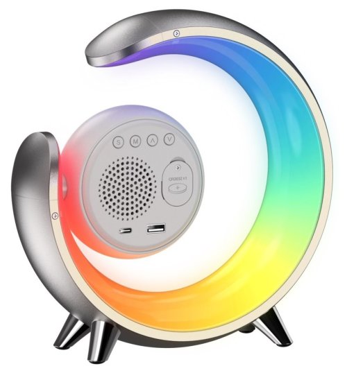 Netradiční LED stolní lampička s praktickým digitálním displejem a s efektním RGB podsvícením. Nabízí teplý odstín světla a plynulé stmívání. Tato lampička je ideální do dětských pokojíčků díky možnosti přehrávání sedmi různých přírodních zvuků k večernímu zklidnění. Samozřejmostí je poté automatické vypnutí v režimu 30/60/90 minut. LED displej disponuje dvoustupňovým nastavením jasu i možností úplného vypnutí. K dispozici je navíc i funkce duálního budíku, která nabízí dva různé časy probuzení, na pracovní týden a druhý na víkend. K dispozici je také USB výstup pro nabíjení mobilních telefonů.