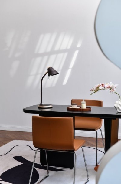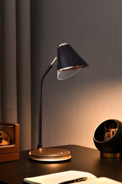 Praktická stolní lampička s pokročilou LED technologií, naklápěcí hlavou a nadčasovým designem. Hnědá imitace kůže v kombinaci se zlatými prvky z ní dělá také stylový vizuální doplněk, vhodný například do reprezentativních kancelářských prostor. Nastavení intenzity osvětlení i barevné teploty probíhá pomocí jediného dotykového tlačítka. Lampička je vybavena také bezdrátovou nabíječkou standardu Qi nabízející výkon 10 W. Mobilní telefon s podporou bezdrátového nabíjení se začne nabíjet při pouhém položení na nabíjecí plochu.
