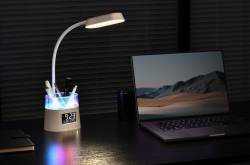 LED stolní lampička s praktickým digitálním displejem a s efektním RGB podsvíceným držákem na tužky nebo dálkové ovladače. Nabízí možnost volit mezi teplým, chladným a přirozeným odstínem světla a třístupňové stmívání světla. LED displej disponuje dvoustupňovým nastavením jasu i možností úplného vypnutí. K dispozici je také volitelné automatické vypnutí svícení po 15/30/45 minutách.