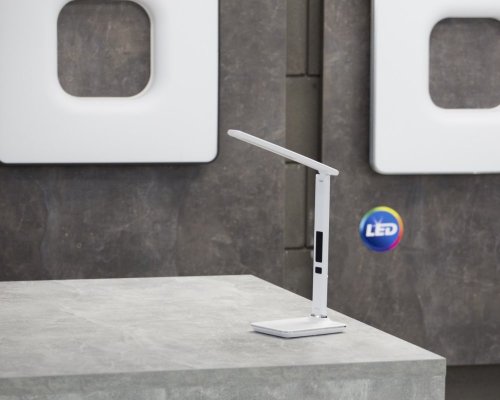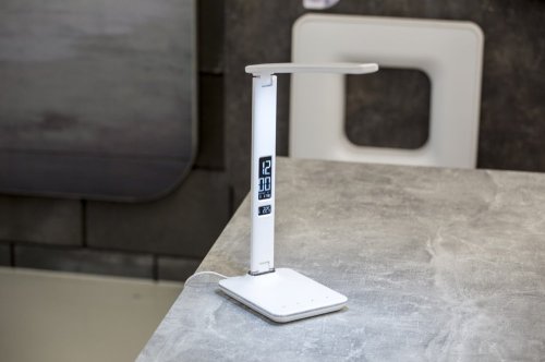 LED stolní lampička v moderním designu se sklápěcím ramenem a informačním panelem, který zobrazuje údaje o aktuálním času, datu a teplotě. Nabídne také dotykové ovládání jasu. Vestavěný USB port se postará o nabíjení vašeho telefonu nebo jiného USB zařízení. Součástí balení je síťový adaptér.