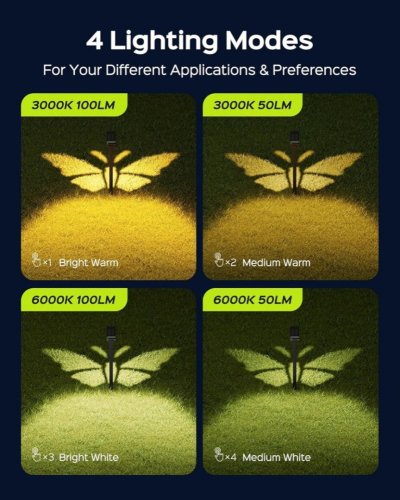 Svítidlo nabízí 4 různé světelné režimy pro maximální přizpůsobení vašim potřebám: Mód 1 - 100% výkon s teplým světlem (3000K), Mód 2 - 50% výkon s teplým světlem, Mód 3 - 100% výkon se studeným světlem (6000K), Mód 4 - 50% výkon se studeným světlem.