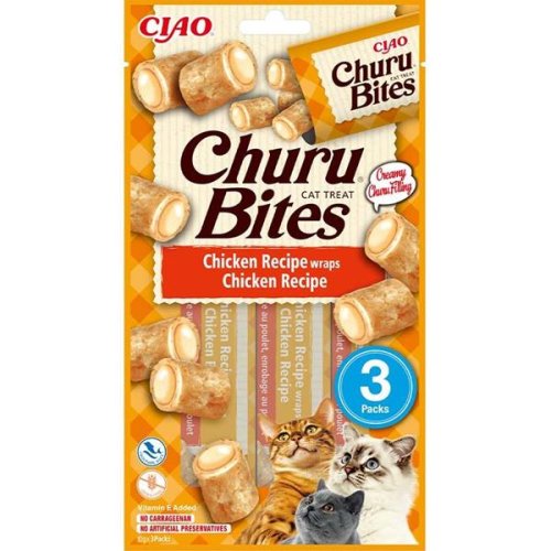 Churu Bites jsou šťavnaté, krémové a extra lahodné pamlsky ve tvaru polštářků s kuřetem z farmářského chovu plněné masovým pyré z kuřete. Inovativní měkká konzistence pamlsků vám umožní trávit společné chvíle s vaší kočkou hravým a interaktivním způsobem. Pamlsky jsou 100% přírodní, nízkokalorické, bez obilovin (grain-free), bez přidaných konzervantů a umělých barviv. Jsou také ideální pro ukrytí tablety na odčervení či jiného léku, který je potřeba kočce nenásilně podat. Složení: kuře (59,1 %), tuňák (16,3 %), tapioka (sušená), vaječný bílek v prášku, kaseinát sodný, kuřecí extrakt, kvasnice a jejich součásti, extrakt ze zeleného čaje. Analytické složky: hrubý protein 28 %, hrubý tuk 5 %, hrubá vláknina 0,3 %, hrubý popel 1,8 %, vlhkost 63 %. Doplňkové látky na 1 kg: Technologické přísady: guarová guma (E412) 6,3 g. Barviva: přírodní látky – botanicky definovaná, papriková pryskyřice 0,1 g. Senzorické přísady: ochucovadla. Nutriční přísady: vitamín E 121 mg. Metabolizovatelná energie: 1 500 kcal/kg Krmný návod: Podávejte jako pamlsek. Po otevření uchovávejte v chladu a spotřebujte co nejdříve. Kočce vždy zajistěte čerstvou pitnou vodu. Nenechejte kočku žvýkat obalový materiál a dbejte, aby jej nespolkla. Při krmení z ruky buďte obzvláště opatrní.