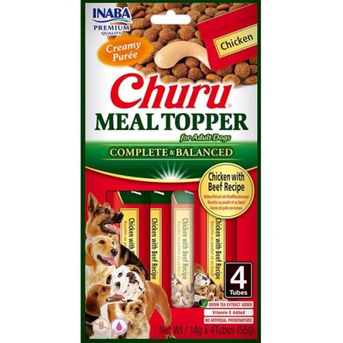 Zpestřete svému psovi suché krmivo lahodnou krémovou polevou s kuřetem a hovězím. Jemné pyré Churu Meal Topper je možné používat také jako kompletní a vyvážené krmivo nebo lízací pamlsek. Je vyrobené ze surovin v kvalitě pro lidskou spotřebu, neobsahuje obiloviny, dochucovadla, konzervační látky ani umělá barviva. Má vysoký obsah vody, čímž přispívá k hydrataci organismu a celkovému zdraví psů. Navíc je obohaceno extraktem ze zeleného čaje, vitamíny a minerály. Složení: kuře 33,1 %, tapioka (sušená), hovězí 1,8 %, výtažek z kuřete 1,6 %, kvasnicový výtažek, uhličitan vápenatý, chlorid draselný, kolagen, síran hořečnatý heptahydrát, hydrogenfosforečnan vápenatý. Analytické složky: hrubý protein 8,5 %, hrubé oleje a tuky 4 %, hrubá vláknina 0,1 %, hrubý popel 1,5 %, vlhkost 85 %. Doplňkové látky na 1 kg: Technologické doplňkové látky: guarová guma Senzorické doplňkové látky: papriková oleopryskyřice, Camellia thea Link. Nutriční doplňkové látky: vitamín E 574 mg, cholinchlorid, monohydrát síranu zinečnatého 26 mg, vitamín B2, monohydrát síranu železnatého 10,4 mg, vitamín A, vitamín B1, síran měďnatý pentahydrát 2 mg, monohydrát síranu manganatého 1,3 mg, jodid draselný 0,5 mg, vitamín D3 182 MJ, seleničitan sodný 0,04 mg, kyselina listová, vitamín B12. Metabolizovatelná energie: 780 kcal/kg Krmný návod: Při použití formou polevy snižte krmnou dávku granulí tak, aby si pes udržel optimální tělesnou hmotnost. Při použití formou plné denní dávky podávejte denně 24 kapsiček (rozdělených na 2–3 porce) na 3 kg tělesné hmotnosti. Množství krmiva se může lišit v závislosti na věku a aktivitě psa. Po otevření uchovávejte v chladu a spotřebujte do druhého dne. Psovi vždy zajistěte přístup k čerstvé pitné vodě.