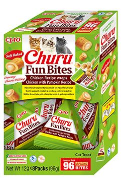 Lahodné pamlsky Churu Fun Bites ve tvaru polštářků s jemnou krémovou náplní kombinují měkkou texturu s neodolatelnou chutí. Jsou vyrobené z kvalitních surovin včetně volně chovaných kuřat, neobsahují obiloviny (grain-free), konzervanty ani umělá barviva a jsou obohacené o vitamín E, který je v kočičí stravě nezbytný a pomáhá chránit buňky před oxidačním poškozením. Zatřeste krabičkou, abyste upoutali pozornost své kočky, a užijte si spolu spoustu zábavy! Ideální pro domácnosti s více kočkami a také pro kočky menšího vzrůstu (méně než 3 kg). Složení: kuře (56,9 %), tuňák (13,5 %), tapioka (sušená), vaječný bílek v prášku, dýně (1,1 %), kaseinát sodný, extrakt z kuřete (0,65 %), kvasnicový výtažek. Analytické složky: hrubý protein 27,3 %, hrubý tuk 4,4 %, hrubá vláknina 0,1 %, hrubý popel 1,9 %, vlhkost 56 %. Doplňkové látky na 1 kg: Technologické přísady: guarová guma. Senzorické přísady: dochucovadla, papriková oleopryskyřice, Camellia thea Link. Nutriční přísady: vitamín E 81 mg. Metabolizovatelná energie: 1 700 kcal/kg Krmný návod: Podávejte jako pamlsek. Po otevření uchovávejte v chladu a spotřebujte do druhého dne. Kočce vždy zajistěte čerstvou pitnou vodu. Nenechejte kočku žvýkat obalový materiál a dbejte, aby jej nespolkla. Při krmení z ruky buďte obzvláště opatrní.