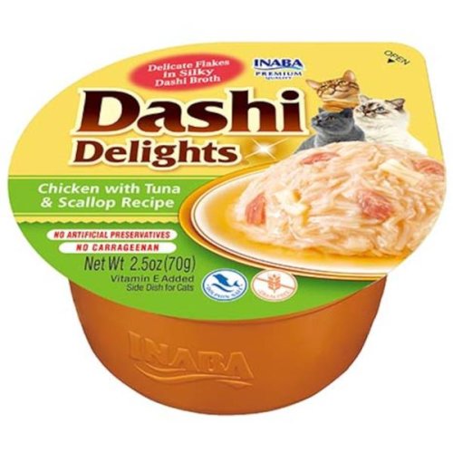 Kuřecí maso, tuňák, hřebenatka a jemné tuňákové vločky v lahodném vývaru. Daši je tradiční japonský rybí vývar z tuňákových vloček známý svou výjimečně lahodnou chutí. Jeho zařazení do jídelníčku vaší kočky může dodat krmení nový rozměr a učinit z něj skutečný zážitek. Daši navíc poskytuje důležité živiny včetně vitamínů a minerálů a díky nízkému obsahu kalorií a tuku je zdravým doplňkem stravy. Je to produkt na bázi vývaru, obsahuje tedy vysoké množství vody, čímž přispívá k hydrataci organismu a k prevenci potíží močového ústrojí. Všechny produkty Inaba jsou bez obilovin (grain-free), zbytečných plniv a pochybných přísad a jsou vyrobené z pravého mořského tuňáka a kuřat chovaných na farmách. Jsou hydratující, výživné a vždy lahodné. Složení: vývar z hřebenatky, kuře 37,4 %, tuňák 1,3 %, hřebenatka 1,3 %, tapioka (sušená), vločky z tuňáka pruhovaného. Doplňkové látky na 1 kg: Technologické doplňkové látky: guarová guma 4,8 g Senzorické doplňkové látky: dochucovadla, Camellia thea Link. Nutriční doplňkové látky: vitamín E 345 mg Analytické složky: hrubý protein 11,2 %, hrubé oleje a tuky 0,5 %, hrubá vláknina 0,1 %, hrubý popel 1 %, vlhkost 86 %. Metabolizovatelná energie: 460 kcal/kg Krmný návod: Podávejte jako pamlsek. Po otevření uchovávejte v chladu a spotřebujte do druhého dne. Kočce vždy zajistěte čerstvou pitnou vodu. Nenechte kočku žvýkat obalový materiál a dbejte, aby jej nespolkla. Při krmení z ruky buďte obzvláště opatrní.
