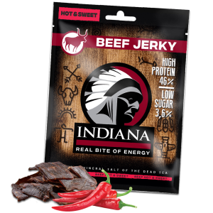 Jerky obecně označuje syrové maso, ze kterého je odstraněn tuk a následně je nakrájeno a vysušeno. Indiana Jerky jako takové pak náš náčelník vyrábí podle starých indiánských receptur. Indiana Jerky jsou tence nakrájené plátky libového masa, dále marinované, sušené a zauzené. Sušení probíhá několik hodin tak, aby si výchozí surovina zachovala jak přirozenou chuť masa, tak svou šťavnatost a pružnost. Pro sportovce nebo zdatného výletníka není zdravější, rychlejší a výživnější svačinky než sáček Indiana Jerky. Je to lehká, na dotek nemastná pochoutka, která obsahuje až 73 % proteinů a jen minimum tuku. Pro výrobu byl zvolen závod, jež splňuje nejpřísnější hygienické normy. Zde je Jerky vyráběno na strojích v majetku firmy Indiana s.r.o.. Přednosti: