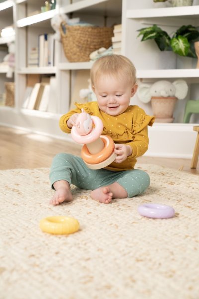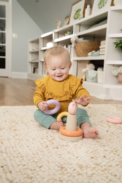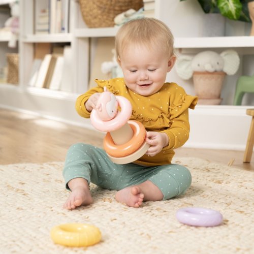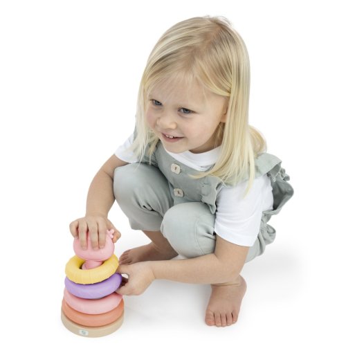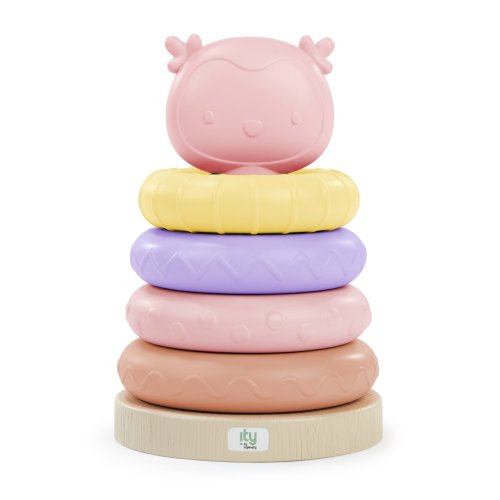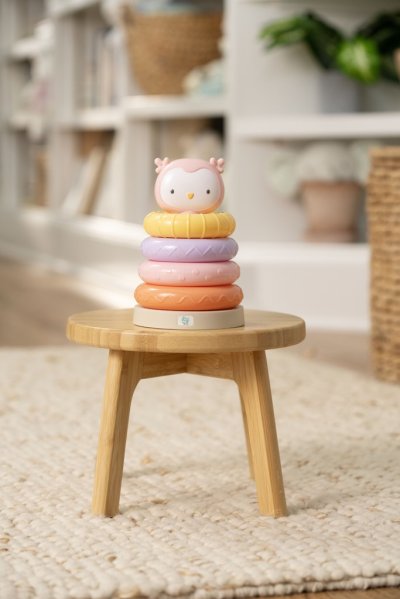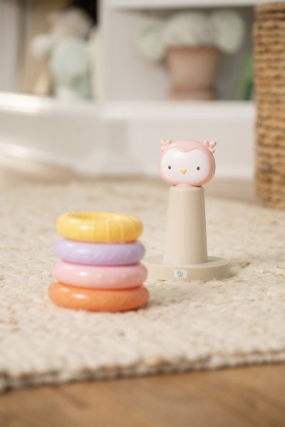Pyramida a super roztomilá sovička Nally se dodávají se stojanem z umělého dřeva a 4 barevnými, lehkými prstenci s více texturami bez obsahu BPA, které se miminku snadno drží a stohují. Skládání pyramidy je super způsob, jak pomoci dětem při rozvíjení smyslových dovedností, jako je učení barev, a pomáhají stimulovat vývoj hrubé motoriky prostřednictvím stohování.