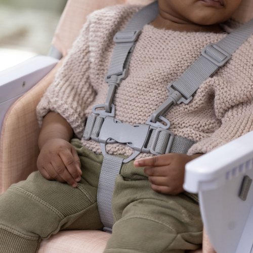 Je to jediná vysoká židle, která nabízí talíř pro podporu schopností děťátka při samokrmení. Jedinečný 3-dílný talíř Twist & Dine se bezpečně uzamkne na svém místě, aby jej malé děti nehodily na zem, a je vhodný do mikrovlnné trouby pro snadnou přípravu jídla. Jak dítě roste, velký pultík se nastavuje do 3 poloh. Pultík se při skladování připevňuje k opěradlu židle. Sedací podložka je omyvatelná v pračce. 5-bodové bezpečnostní pásy zajišťují bezpečnost dítěte.