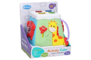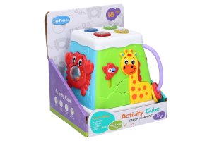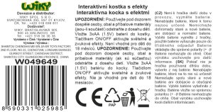 Interaktivní kostka. Velikost 13 cm. Baterie 3xAA nejsou součástí. Tlačítko on/off, vydává světelné a zvukové efekty.