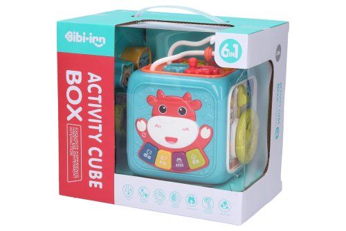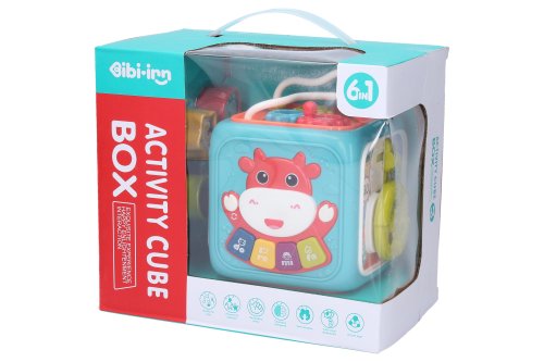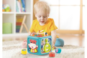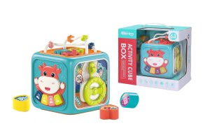 Interaktivní kostka. Rozměry 13x12,5x15,5 cm. 3xAA baterie nejsou součástí. 4 vkládací kostky. Součástí vkládačka, piano, hodiny, ozubená kolečka, volant, dvířka. Piano - 4 módy. 1. mód - piano, 2. mód - 4 písničky, 3. mód - světelná hra, 4. mód - zvuky zvířat, 5. mód - 20 melodií.