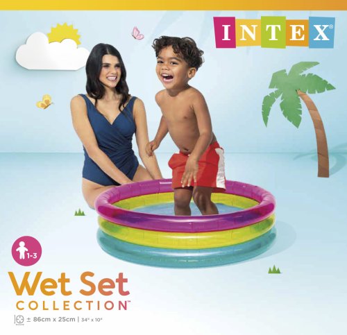 Dětský nafukovací bazének na zahradu nebo k vodě na dovolenou? Přesně toto nabízí firma Intex a její pestrobarevný Rainbow Baby Pool. Ten je vyroben z testovaného kvalitního vinylu s kapacitou vodní stěny 17 cm. Samozřejmou součástí balení je i opravná sada. Produkt splňuje veškeré požadované bezpečnostní normy. Rozměry: 86 x 25 cm Objem: 68 litrů při naplnění do výšky 17 cm Materiál: vinyl Tloušťka podlahy a stěny: 0,18 mm a 0,20 mm Opravná sada součástí balení. Vhodné pro děti od 1 do 3 let.