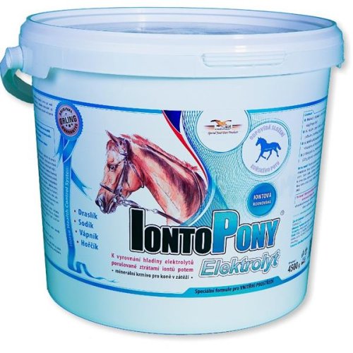 Iontopony Elektrolyt je minerální doplňkové krmivo pro koně s obsahem minerálních solí a bílkovin určené pro vyrovnání elektrolytické bilance porušované ztrátami iontů potem v období zvýšené zátěže. V průběhu fyzické zátěže ztrácí organismus koně v závislosti na intenzitě a délce trvání zátěže, teplotě a vlhkosti prostředí 5 až 15 litrů tekutin ve formě potu. Pot koně je silně hypertonický a obsahuje značná množství iontů sodíku, draslíku a chlóru, vysoké procento bílkovin (převážně albuminů) a dále významné množství iontů vápníku a hořčíku. Ideální obsah vody a iontů v těle má svou horní a dolní hranici. V tomto fyziologickém rozmezí probíhají všechny děje výměny látek a energií ideálním způsobem. Jakákoliv změna nad a pod toto ideální rozmezí má okamžitý přímý dopad na výkonnost. Tento negativní dopad je o to větší, čím je větší změna v obsahu těchto látek. Optimalizace obsahu iontů a vody v těle je základním předpokladem jak pro efektivitu tréninkového procesu, tak i pro kvalitu vlastního výkonu. IONTOPONY Elektrolyt svým složením napodobuje složení koňského potu a navrací tak do organizmu látky skutečně potem vyloučené v optimálním množství a poměru. Rozsah dávkování umožňuje příjem právě takového množství elektrolytů, které kůň při daném tréninku ztratí. Podávání IONTOPONY Elektrolyt udržuje homeostázu organizmu koně, stabilizuje výkonnost a přispívá k rychlejší regeneraci koně. Indikace: