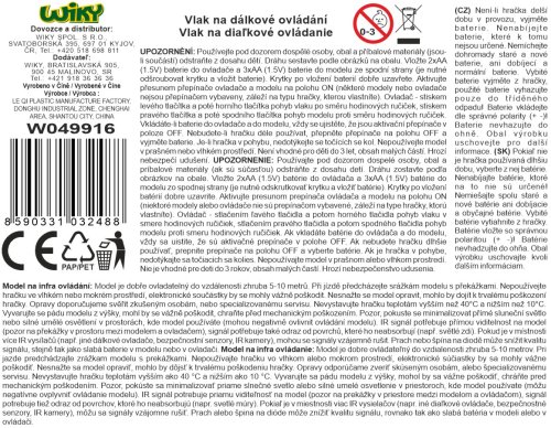 Vlak RC na dálkové ovládání s dráhou. Rozměry sestavené trati 62x62 cm. Délka trati, 176 cm. Vlak vydává světelné a zvukové efekty. Set obsahuje 30 dílů. Infračervený port. Vagóny jsou propojeny magnety. Vlak - 3xAA, nejsou součástí. Ovladač - 2xAA, nejsou součástí. ON/OFF spínač uprostřed ovladače. Pohyb po směru hodinových ručiček - levé tlačítko svítí, zmáčkni horní tlačítko. Pohyb proti směru hodinových ručiček - pravé tlačítko svítí, stiskni dolní tlačítko.