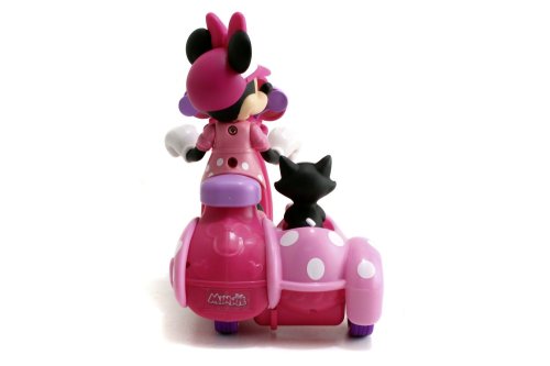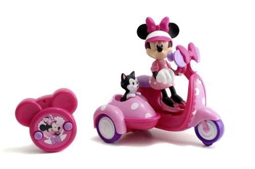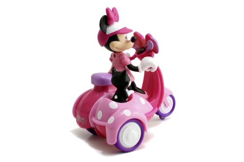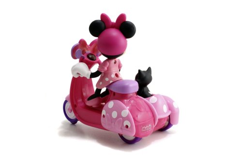 IRC scooter se sajdkárou s figurkou Minnie a kočičkou, 1 kanál, chod vpřed, vzad se zatáčením. Velikost 19 cm. Baterie ovladač 2x 1,5V R03, scooter 3x 1,5V R6, baterie nejsou součástí.