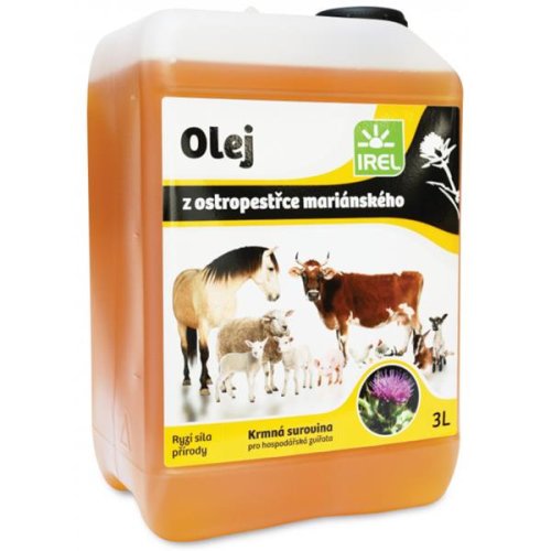 Jedná se o olej z plodu ostropestřce mariánského (Silybum marianum (L.) Gaertn.) lisovaného za studena. Tento produkt se používá jako senzorická (zchutňující) doplňková látka při krmení zvířat. Ve srovnání s řepkovým olejem, který nemá téměř žádné esenciální mastné kyseliny, má ostropestřecový olej kolem 60% kyseliny linolové. Tato kyselina je hlavním zástupcem esenciálních mastných kyselin a zároveň patří mezi nejlepší zdroje mastných kyselin pro organismus. Další benefitem ostropestřecového je vysoký obsah přírodního vitamínu E (ve formě alfa-tokoferolu), který přispívá k ochraně buněk před oxidativním stresem. Ostropestřecový olej je velmi bohatý na přírodní fytosteroly, které hrají zásadní roli při metabolismu tuků a na esenciální mastné kyseliny, zvláště na omega-6. Příznivě ovlivňuje zdravotní stav kůže a srsti a podporuje trávení a fertilitu. Doporučené dávkování: 15-30 ml na 100 kg hmotnosti zvířete na den. Nalít na seno nebo granule.