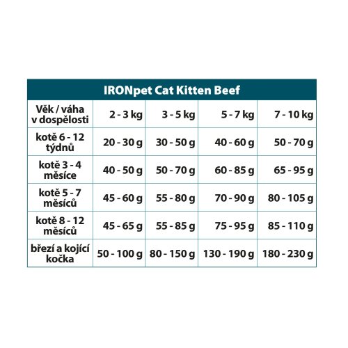 Zdrojem živočišných bílkovin s vyváženým poměrem bílkovin a tuku je použito hovězí maso. IRONpet Cat Kitten Beef (Hovězí) neobsahuje lepek a kuřecí maso je tedy hypoalergenní, snadno stravitelné a vhodné i pro kočky s citlivým trávením.