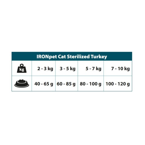 Zdrojem živočišných bílkovin s vyváženým poměrem bílkovin a tuku je použito krůtí maso. IRONpet Cat Sterilized Turkey (Krůta) neobsahuje lepek a kuřecí maso je tedy hypoalergenní, snadno stravitelné a vhodné i pro kočky s citlivým trávením.