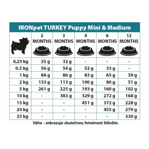 Jediný zdroj živočišných bílkovin s vyváženým poměrem bílkovin a tuku je použito krocaní maso - monoproteinová strava výrazně snižuje riziko vzniku intolerancí a potravinových alergií. IRONpet Dog Puppy Mini & Medium Turkey (Krocan) neobsahuje lepek a kuřecí maso je tedy hypoalergenní, snadno stravitelné a vhodné i pro psy s citlivým trávením.