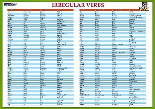 Karta formátu A4 vytištěná na tvrdém laminovaném kartonu. Karta je užitečnou pomůckou při výuce anglického jazyka. Na jedné straně je v přehledné tabulce vyobrazen seznam nepravidelných sloves. Na druhé straně jsou pak příklady vět, jak se nepravidelná slovesa používají. Karta tak slouží k rozšíření slovní zásoby a k osvojení základního použití slovíček.