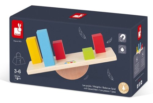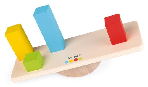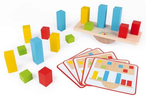 Dřevěná balanční skládačka! Zábava spočívá v tom, že děti ukládají barevné kostky podle přiložených předloh. Musí to ale udělat ve správném pořadí tak, aby se rampa příliš nenaklonila na jednu ze stran, a aby se nedotkla podložky. Děti hrou objevují zákonitosti převažování, zjistí co je těžší a co lehčí, kdy se nakloní balanční podložka doleva a kdy doprava. Samožejmě, že si mohou barevné kostky ukládat jen tak bez předlohy. Je to skvělé cvičení, které zároveň baví a rozvíjí manuální zručnost, pozorování a znalost barev dítěte. Navíc učí trpělivosti a prostorovému vnímání, což je pro děti v tomto věku velmi důležité. Balení obsahuje 5 oboustranných předloh, dřevěnou rampu a 16 barevných kostek. Vhodné pro děti od 3 let.