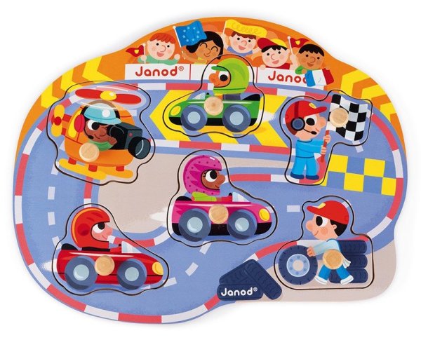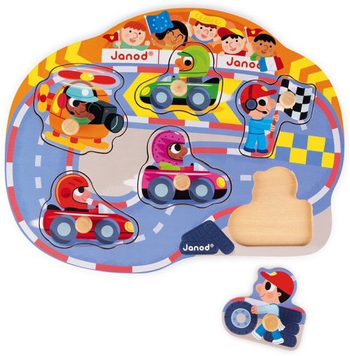 Barevná dětská vkládačka se závody formulí. Vkládačka děti učí všímavosti, rozvíjí představivost a paměť. Dřevěná podložka usnadňuje skládání a rámečky zabezpečují, aby jednotlivá dřevěná zvířátka držela na svých místech. Vhodné pro děti od 12 měsíců.