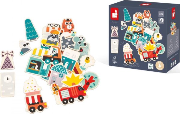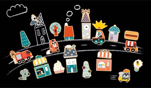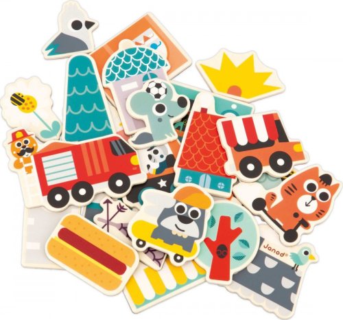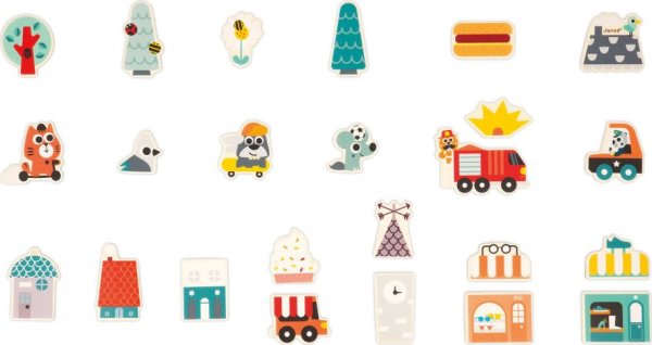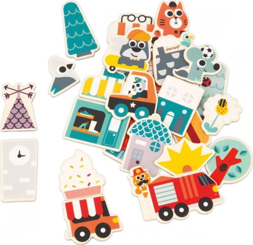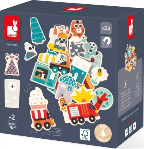S touto sadou 24 dřevěných magnetů můžete stavět na všech magnetických površích! Sada dětských magnetek obsahuje kromě koloběžky a skateboardu také magnetky s vozidly (hasičské auto, policejní auto, auto s jídlem) a prvky potřebné k sestavení obchodů, domů a k tomu, aby toto město obydlené veselými zvířátky vzkvétalo. Magnetky lze míchat a vytvářet tak mnoho různých kombinací.