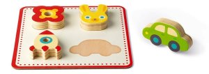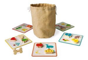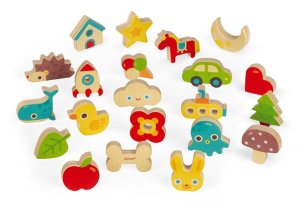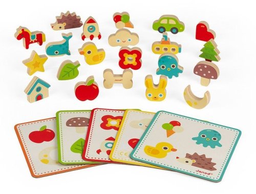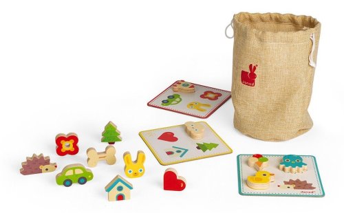 Hmatová hra pro rozvoj jemné motoriky a rozpoznávání barev, geometrických tvarů a zvířátek. Malé děti si mohou karty s obrázky položit před sebe a z tvarů vybrat a správně přiřadit - tvar položit na správné místo na kartičce. Ale jinak je dřevěné pexeso určeno pro dva až pět hráčů. Hráči si rozdají náhodně kartičky, které si položí každý před sebe. V tašce jsou uloženy dřevěné tvary. Dohromady jich je 21. Hráči si po jednom náhodně vybírají z pytlíku předměty a pokud ho mají na kartičce, přiloží ho na správné místo na ní. Vyhrává hráč, který zaplní svou kartičku nejrychleji. ALE POZOR! Jeden tvar je tam navíc. Pokud vytáhneš z pytlíku kostičku, musíš vrátit ze své karty předměty zpět do tašky. Vhodné pro děti od 3 let.