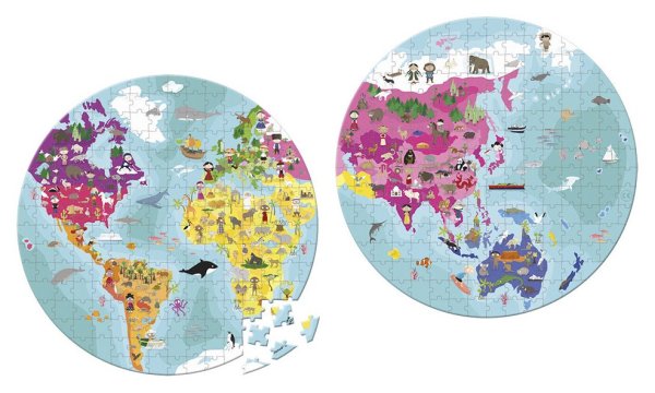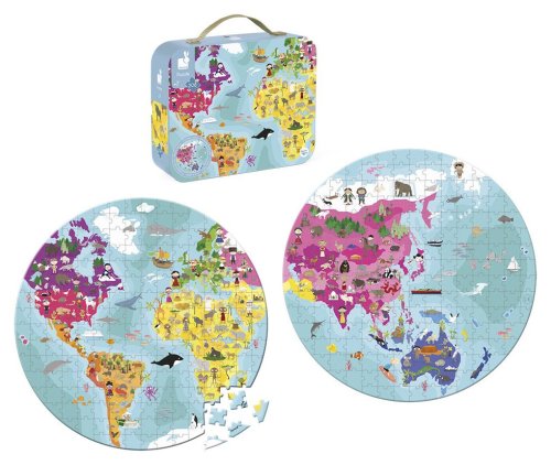 Dětské pozorovací kulaté puzzle JANOD. Nádherně ilustrované puzzle s motivem východní a západní polokoule naší planety s obrázky živočichů, to vše v praktickém kufříkovém balení. Děti i dospělí si užijí zábavu při skládání 208 dílků puzzle, a zároveň se učí, kde žijí jednotlivé druhy zvířátek. Rozměr poskládaných puzzle je průměr 50 cm. Rozměr složeného puzzle cca průměr 50 cm