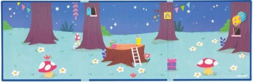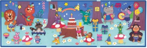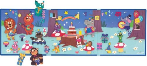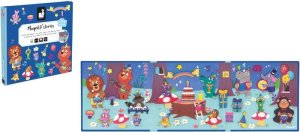 magnetická kniha s jednoduchým otevíráním, 30 magnetických dílků s motivem oslavujících zvířátek, rozvíjí fantazii, kreativitu a vyprávění příběhů, ideální na doma i na cesty, magnetky pevně drží na pozadí, lehká, tenká a snadno přenosná.