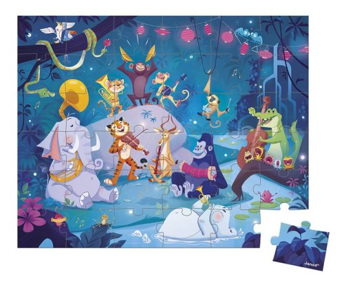 Puzzle JANOD s obrázkem zvířátek, která si užívají zábavu na letním festivalu. Puzzle je baleno v originálním a praktickém kufříku vhodném na doma i na cesty. Součástí balení je plakátová předloha. Rozměr složeného puzzle cca 50 x 40 cm