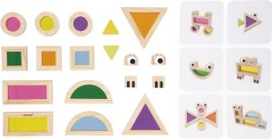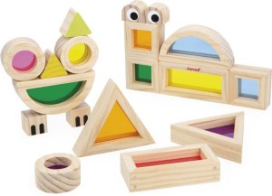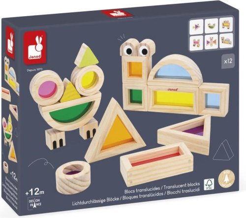 12 barevných průhledných kostek v různých odstínech (růžová, modrá, zelená aj.) 6 potištěných dřevěných bloků pro tvorbu veselých zvířátek 6 inspiračních šablonových karet , které pomáhají s prvními nápady a motivují k vlastní tvorbě