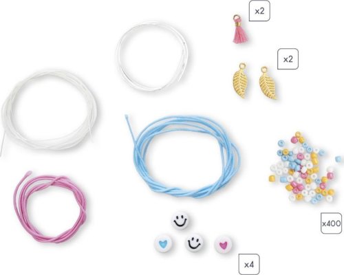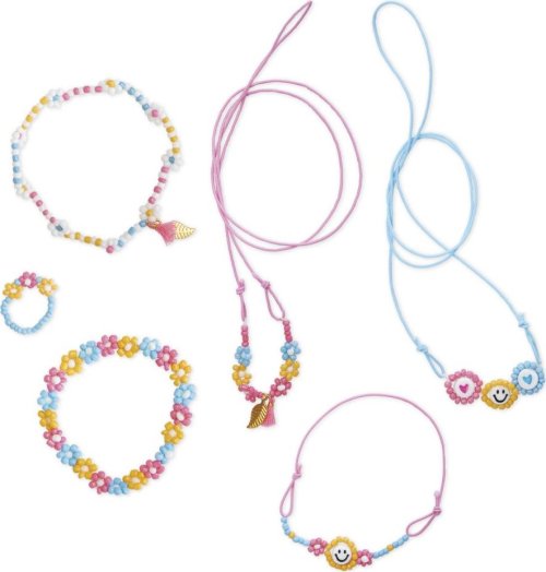 tato kreativní sada nabízí dětem možnost vyrobit si 6 květinových šperků sponky si mladé umělkyně vytvoří a následně své výtvory mohou hrdě nosit nebo podarovat kamarádky z této kreativní sady lze vyrobit 3 náramky, 2 náhrdelníky a 1 prsten zhotovení 6 šperků zabere přibližně 3-4 hodiny, hotové výrobky tak dětem dodají uspokojení z vlastní tvorby ideální aktivita k podpoře kreativity, motoriky, trpělivosti a soustředění balení obsahuje: 1 bílá voskovaná nit, 2 elastické šňůrky (modrá a růžová), 1 průhledná nylonová nit, 2 korálky "smajlík", 2 korálky "srdíčka" (růžová a modrá), 4 druhy korálků (bílá, růžová, oranžová a modrá), 2 malé neonově růžové střapce a 2 zlaté přívěsky
