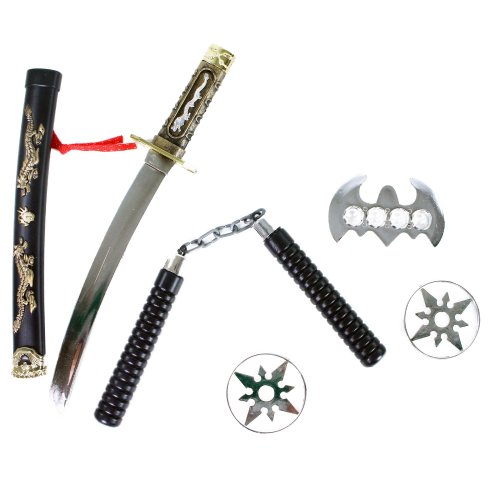 Tato sada japonského meče s příslušenstvím, by neměla chybět žádnému malému bojovníkovi! Meč s pouzdrem je dlouhý cca 42 cm a je zdoben zlatými a stříbrnými ornamenty.