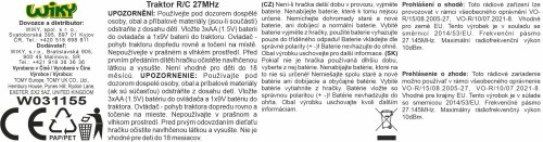 JD Kids John Deere RC na dálkové ovládání, traktor Johnny. Velikost 15,5 cm. Ovládání - pohyb dopředu a otáčení se na místě. Frekvence 27 MHz. Ovladač - 3xAA (LR6) baterie není součástí, traktor 1x9v (6lr61) není součástí.