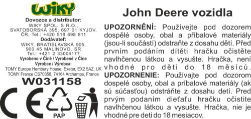 JD Kids John Deere traktor a sklápěč set. Velikost 16 cm. Sklápěcí korba a pohyblivá radlice. Volná kola.