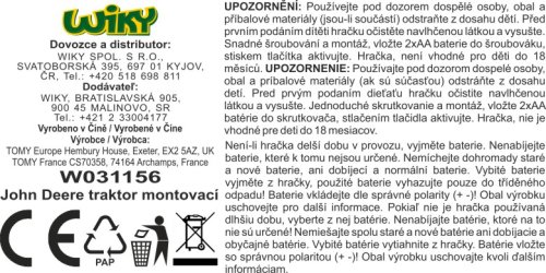 JD Kids John Deere Traktor Johnny montovací. Délka traktoru 23 cm, Délka šroubováku 14 cm, 3 vyměnitelné klíče. Baterie 2xAA (LR6) součástí balení. Volná kola.